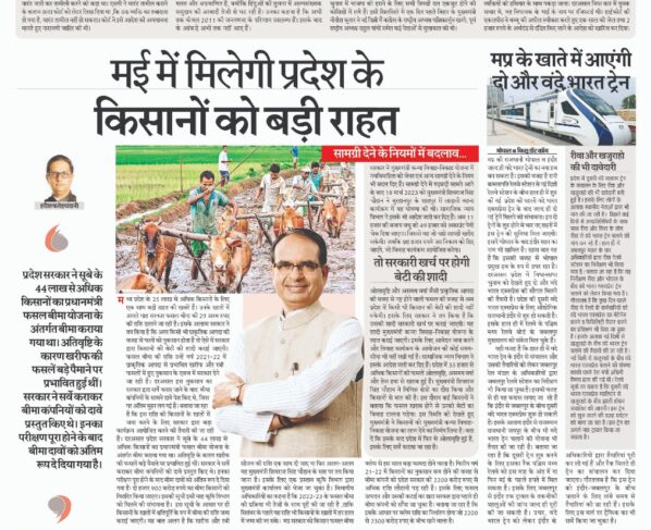 हरीश फतेहचंदानी मध्य प्रदेश के 25 लाख से अधिक किसानों के लिए एक साथ बड़ी राहत की खबरें हंै। उनके खातों में अगले माह सरकार फसल बीमा की 29 अरब…