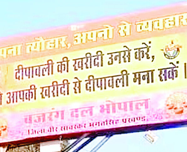 हिंदुओं से करें खरीदारी, अपना त्योहार, अपनो से व्यवहार भोपाल<बिच्छू डॉट कॉमदीपावली के अवसर पर बजरंग दल ने अपना त्योहार, अपनों से व्यवहार के संदेश के पोस्टर शहर में लगाए,…