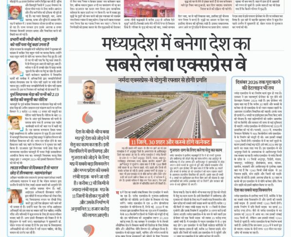 नर्मदा एक्सप्रेस-वे दोगुनी रफ्तार से होगी प्रगति गौरव चौहानमप्र में देश का सबसे लंबा सिक्स लेन एक्सप्रेस वे बनने जा रहा है। नर्मदा एक्सप्रेस-वे गुजरात-छत्तीसगढ़ कॉरिडोर को जोड़ेगी। इससे प्रदेश…