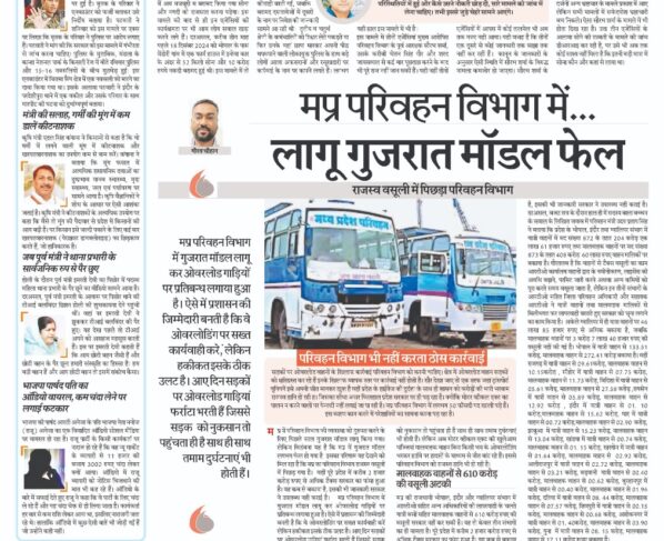 राजस्व वसूली में पिछड़ा परिवहन विभाग गौरव चौहानमप्र में परिवहन विभाग की व्यवस्था को दुरूस्त करने के लिए पिछले साल गुजरात मॉडल लागू किया गया। लेकिन विडंबना यह है कि…