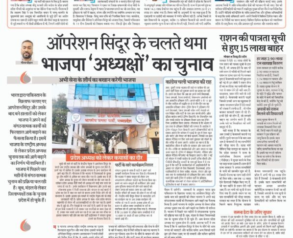 अभी सेना के शौर्य का बखान करेगी भाजपा गौरव चौहानमप्र भाजपा अध्यक्ष सहित राष्ट्रीय अध्यक्ष का चुनाव फिलहाल कुछ दिन और थमा रहेगा। इसकी वजह है ऑपरेशन सिंदूर। भाजपा आलाकमान…